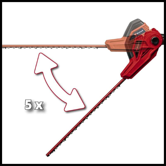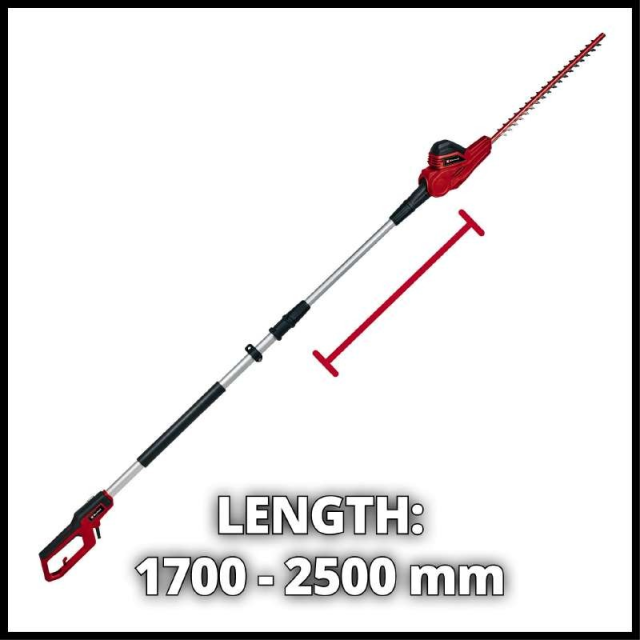 Електричний кущоріз телескопічний Einhell GC-HH 5056 потужністю 500 Вт є дуже ефективним інструментом, який забезпечує гарне обрізання високих живоплотів, чагарників та кущів завдяки ручці, яку можна висунути до 250 см. Рухливі у протилежних напрямках двоклинкові леза виготовлені з обробленої лазером та заточені алмазом сталі з відстанню між зубцями 20 см, довжиною леза 56 см і довжиною різу 47 см, ріжуть товсті гілки без проблем та забезпечують чисті результати різу. Регульований ремінь для перенесення кущів телескопічного Einhell GC-HH 5056 сприяє рівномірному розподілу ваги і безпечній роботі. Робоча висота кущорізу завдяки телескопічній штанзі, що розширюється, вільно регулюється від 1,70 м до 2,5 м. Таким чином, ви можете досягти робочої висоти від 3,0 м до 4,0 м. У телескопічному кущорізі Einhell GC-HH 5056 використовується металевий редуктор та шестерні, які забезпечують довгий термін служби. Хороша ергономіка для зручної роботи забезпечується додатковою ручкою та м'якою накладкою на основній рукоятці. Кабельний затискач для кріплення кабелю дозволяє зняти натяжіння та захищає кабель живлення. Кущоріз телескопічний Einhell GC-HH 5056 поставляється із міцним захисним кожухом ножів для зручного транспортування або зберігання.