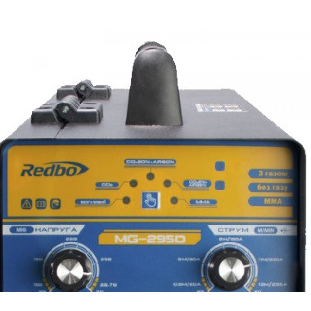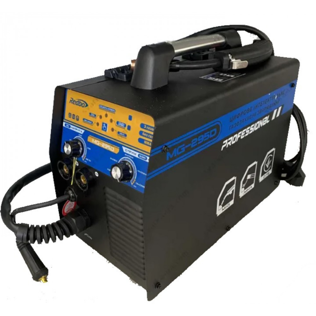 Зварювальний напівавтомат Redbo MG-295D входить в лінійку побутової техніки для зварювання. Силові транзистори у нього інверторні. Це агрегат зручний і простий в роботі і з ним виконують як дугову ручну зварку з електродами (різними за діаметром і типу покриття), так і напівавтоматичну, зі зварювальної або флюсового порошковим дротом, в середовищі захисного газу (аргонового або вуглекислого) і без газу. Витрата електроенергії з ним економний, а коефіцієнт корисної дії високий. Агрегат має покращені технічні характеристики, кілька систем захистів від низької напруги, перегрівання, короткого замикання і додаткових корисних функцій, які спрощують роботу з ним і роблять її більш безпечною, а результат завжди якісним. При приєднанні через євророз'єм вентильной пальника з контактним підпал з ним проводять і аргонно-дугове зварювання.