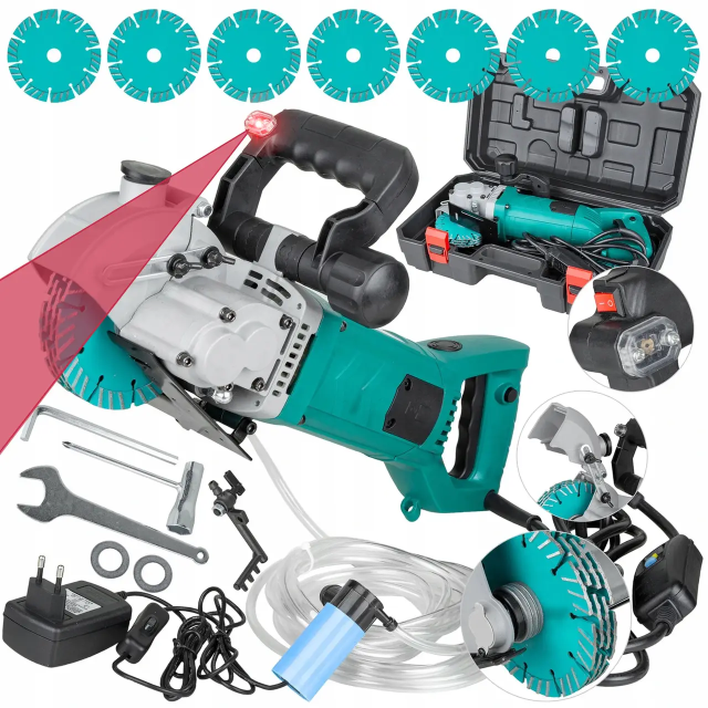 Представляється Новий штроборіз, який має 4 диски на валу. Це задля того, щоб робити суцільну паз і не працювати в подальшому перфератором. Також у комплекті є додаткові 3 диски. Він обладнань ПЗВ (пристрій захисного вимкнення), задля того що іде подача води через насос (який йде в комплекті). І якщо є подача води, то завжди потрібне ПЗВ. Штроборіз має лазерний рівень на додатковій ручці. У комплекті йдуть усі потрібні ключі для розбору-збору інструмента і заміни дисків, також йдуть додаткові шайби для налаштування ширини штроби.