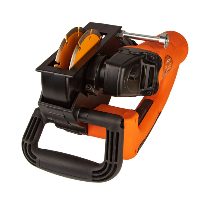 Штроборіз комплектується універсальним затискачем для підключення пилососу. Для зручності виконання вертикальних або горизонтальних робіт встановлено додаткову ручку. А рухомий кожух, що щільно прилягає до поверхні, не пропускаючи пил у приміщення.