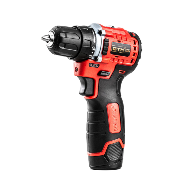 GTM DS12/38BL - компактний дриль-шурупокрут професійного класу з живленням від Li-Ion акумуляторів напругою 12 В. У шурупокруті встановлений швидкозатискний 10 мм патрон для роботи з бітами і свердлами. Двигун у цій моделі безщітковий, що значно зменшує розміри корпусу і вагу. Редуктор двоступеневий і дає змогу регулювати максимальну швидкість залежно від завдання. У даній моделі присутні 20 режимів для закручування кріплень, з максимальним крутним моментом 38 Н*м, а також режим свердління.