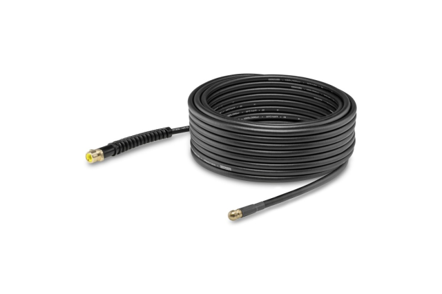 Дозволяє прочищати труби і стоки, що засмітилися. Чотири спрямовані назад струмені високого тиску забезпечують просування шлангу по трубі і видалення бруду. Високоякісний гнучкий шланг оснащений відмітками і маркерним кільцем, що дозволяє відстежувати просування по трубі. Шланг армований текстильної опліткою, захищений від перегину, забезпечений дуже коротким латунним соплом для максимальної рухливості і довговічним латунним роз'ємом. Комплект для побутових апаратів високого тиску Kärcher може застосовуватися всередині будинку і на відкритому повітрі.