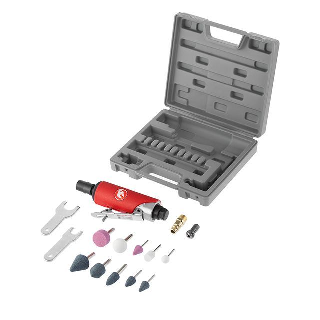 Пряма шліфувальна машина виконає будь-яке завдання, пов'язане з точною обробкою, достатньо підібрати необхідну насадку. Встановлений простий та надійний цанговий затискач 6 мм. Завдяки високій швидкості ефективно справляється зі своєю роботою, не вимоглива до джерела повітря, витрата становить 115 л/хв.