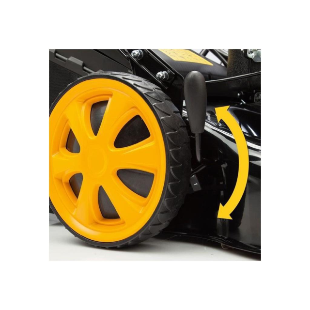 - 10-рівневий важіль дає можливість налаштувати оптимальну висоту косіння відповідно до уподобань користувача. Мінімальне значення 2.5 см, максимальне — 7.5 см.