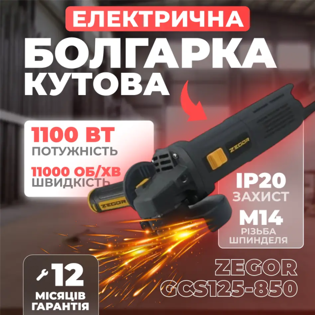 Кутова шліфмашина Zegor GCS125-850 для різання та шліфування, 125 мм, 1100 Вт, щіткова
