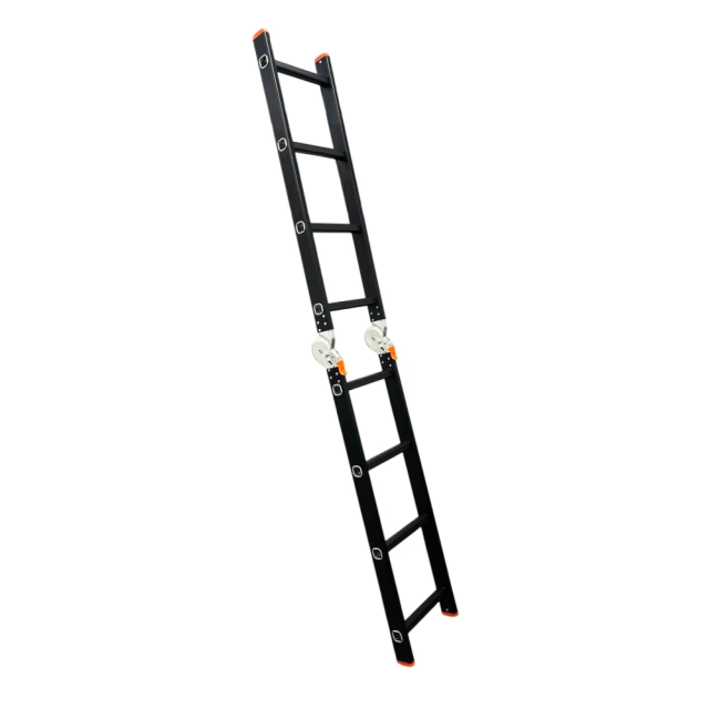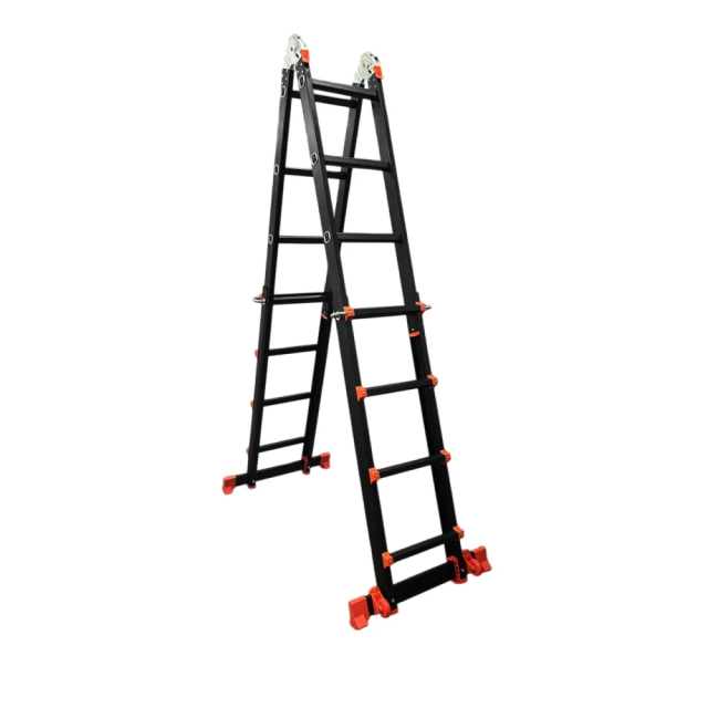 GTM KMP404D - легка драбина-трансформер підвищеної міцності, яка призначається для постійного промислового і побутового використання. Профіль виготовлений з авіаційного алюмінію, має змінну товщину стінки і додатково посилений ребрами жорсткості. Для додаткової стійкості до пошкоджень корпус пофарбований в чорний колір методом електрофорезу. Міцні шарніри і замки надійно фіксують драбину в будь-який з обраних форм. Завдяки такій конструкції трансформер GTM KMP404D здатний витримати без деформації навантаження в 150 кг.