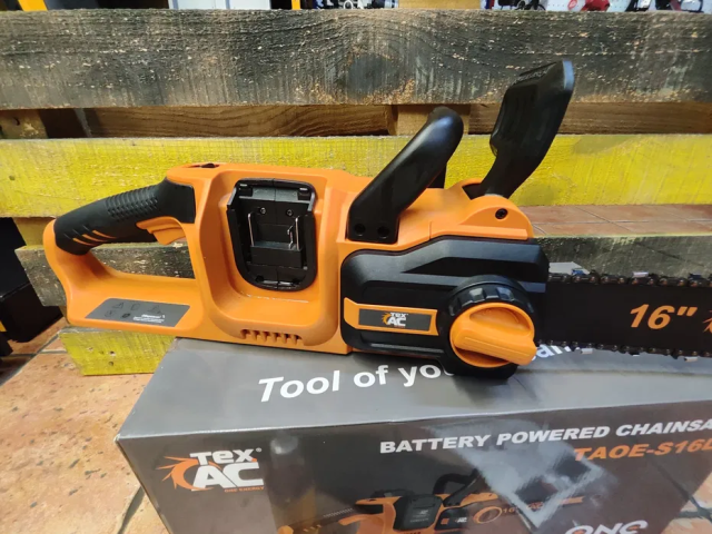 Tex.AC TAOE S16L — це потужна акумуляторна ланцюгова пила з довжиною шини 16 дюймів (406 мм), призначена для обрізання гілок, заготівлі дров та валки дерев середнього діаметра. Працює на двох акумуляторах 20 В серії Tex.AC ONE ENERGY, забезпечуючи високу продуктивність та мобільність без проводів.