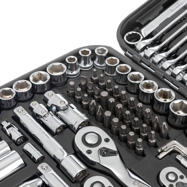 Набір інструментів виготовлений з міцної та витривалої Cr-V сталі. Головки та тріскачки з Cr-V 50BV30 сталі вирізняються довготривалим строком служби, мають запас міцності та стійкі до навантажень. Двошарове нікелеве покриття забезпечує антикорозійні властивості інструментів. Кожна біта виготовлені з сталі Cr-V 6150 з відмінними показниками твердості та пружності у своєму сегменті.
