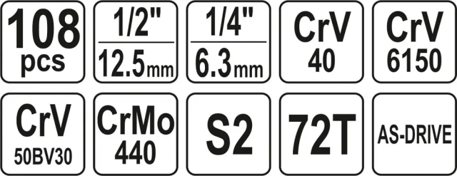 Професійної якості набір інструментів марки Yato призначений для сервісів і майстерень. Ключі торцеві і привід головок виготовлені з міцної інструментальної сталі, нержавіючої хром-ванадієвої сталі CrV 50BV30. Кришка оснащена AS-Drive, збільшуючи максимальний крутний момент на 25%, з повним захистом крайок гайок, ковпачком з двокольоровою обробкою поверхні. До складу набору входять також біти, зроблені з твердої сталі S2. Цей набір дозволяє виконувати роботу, що вимагає дуже високих навантажень і точність. Дозволяє виконувати багато видів діяльності, послуги, пов'язані з відкручуванням і закручуванням різьбових з'єднань різних розмірів.