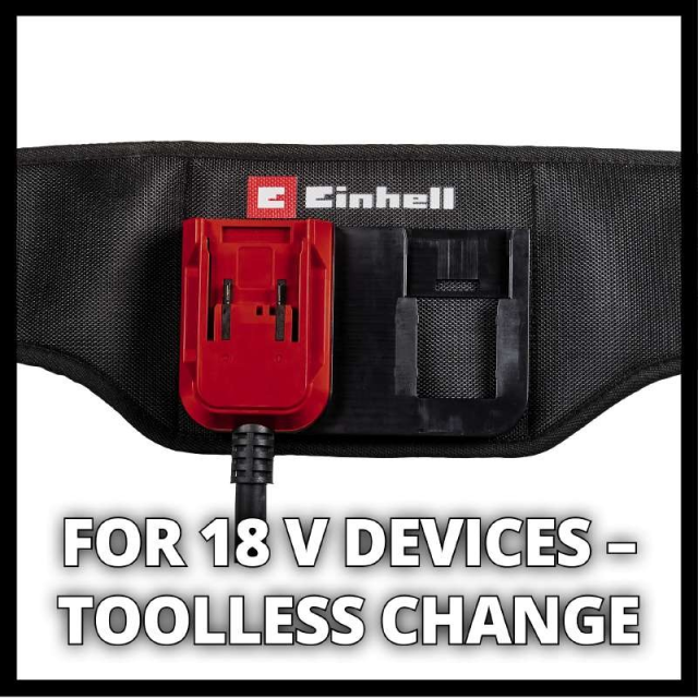 Акумуляторний ремінь Einhell GE-PB 36/18 Li є практичним помічником у всіх роботах, пов’язаних з використанням інструментів серії Einhell Power X-Change. Він дозволяє носити акумулятор безпосередньо на тілі. Так як вага 2-х акумуляторів може бути до 2 кг, що значно збільшує вагу інструменту та збільшує навантаження на користувача інструменту та може призводити до швидкої стомлюваності, ремінь дозволяє зменшити вагу акумуляторного інструменту Einhell. Міцна конструкція GE-PB 36/18 Li має стегновий ремінь довжиною 150 см для максимального комфорту. Тому робота з акумуляторними інструментами менш виснажлива, особливо під час інтенсивних завдань. Цей багатофункціональний пристрій сімейства Power X-Change підходить для інструментів 36 В і 18 В, завдяки чому другу кишеню для батареї легко вийняти, коли достатньо 18 В. Бажаним помічником під час виконання складних робіт у вузьких місцях є додатковий гачок для кабелю. Завдяки великій пряжці ремінь відкривається просто і його зняття займає лише мить.