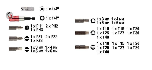 Набір біт Bit-Box kwb 32 шт., 30 шт. бит хромованадієва сталь, шестигранник 1/4" ISO 1173, C 6.3, 25 мм,, бітотримач із швидкозажимним патроном, 1/4" шестикутник ISO 1173, E 6.3, коробка з твердого пластику зі зручною кліпсою для ременя.