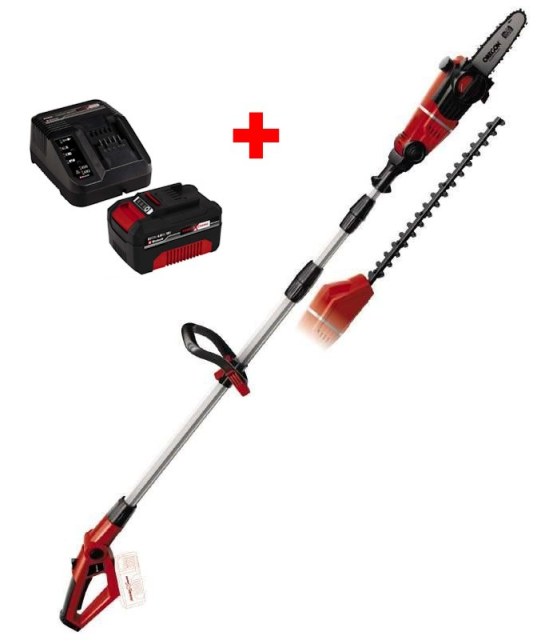 Акумуляторний висоторіз - кущоріз лінійки Power X-Change system Einhell GE-HC 18 Li T- Solo серії Expert plus являє собою потужний багатофункціональний інструмент, який допоможе Вам зрізати високі гілки дерев, найвищий живопліт, чагарник з землі, не використовуючи при цьому додаткові пристосування. Ви можете працювати саме там, де це Вам необхідно завдяки відсутності кабелю живлення, немає необхідності в розетках і кабельних барабанах і повністю відсутній ризик випадкового пошкодження кабелю або можливість спіткнутися об нього. Регульований ремінь для перенесення телескопічної акумуляторної пили Einhell GE-HC 18 Li T- Solo сприяє рівномірному розподілу ваги і безпечній роботі. Довжина пилки з ріжучим кріпленням завдяки розширюваній телескопічній штанзі вільно регулюється від 1,83 м до 2,77 м. Таким чином, ви можете досягти робочої висоти від 3,8 м до 4,5 м. У телескопічної акумуляторної пили-секатора Einhell GE-HC 18 Li T- Solo використовується металевий редуктор і шестерні, які забезпечують довгий термін служби, високоякісна шина і ланцюг фірми OREGON (USA). Наявність масляного бака дозволяє автоматично змащувати ланцюг. Ланцюг можна легко натягнути і поміняти без використання будь-яких інструментів. Леза кущоріза виготовлені зі спеціальної сталі, вирізані лазером і мають алмазну заточку, чим забезпечують чисті результати різу. Інструмент поставляється з Power X-Change акумулятором 18V 4,0 Ah і зарядним пристроєм.