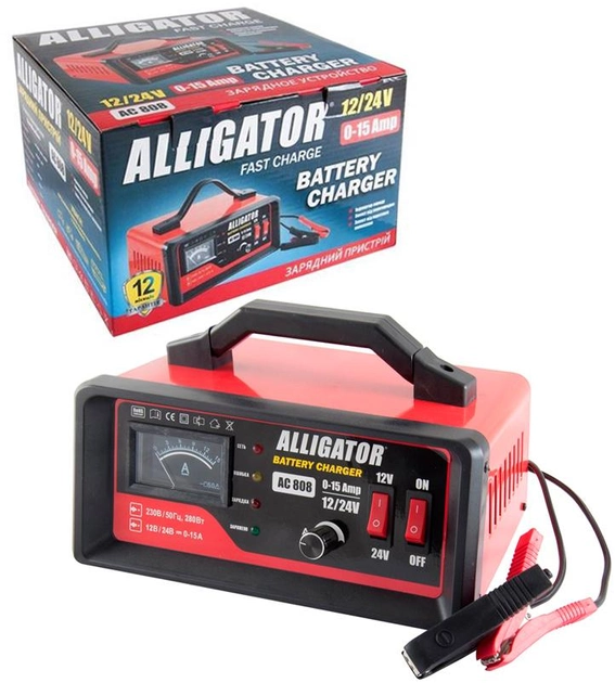 Використовувати пристрій можна і для вантажівок, оскільки він підходить для батарей з вихідною напругою 12 або 24 В. Сам прилад має компактний розмір і невелику вагу, його можна піднімати за допомогою зручної ручки. Довжина дроту 1,7 метра, підключається за допомогою крокодилів. Слідкувати за рівнем зарядки допоможе амперметр, який вбудований у бічну панель.