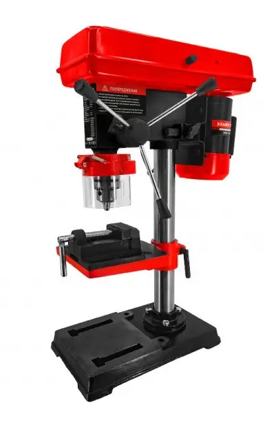 Свердлильний верстат Start Pro SBD-1500 - використовується для виконання свердлильних робіт по металу, дерева, пластмаси. У даних моделях передбачено, можливість регулювання швидкості обертання, зміни кута нахилу робочого столу, встановлення необхідної глибини свердління, що дозволяє виконувати роботи з високою точністю і продуктивністю. При наявності відповідних насадок, верстат може бути застосований для полірування або гравіювання. Дана модель свердлильного верстату оснащена двигуном потужністю 1500 Вт. Електропривод і шпиндель закріплені на вертикальній конструкції і можуть бути відрегульовані по висоті. Особливістю верстата є ступінчасті шківи і кліноременная передача, що дозволяють задавати 9 швидкостей обертання в межах 280-2350 об/хв. Глибина свердління регулюється за допомогою індикаторної лінійки, що дуже зручно при свердлінні глухих отворів. Дана модель призначена для роботи в умовах помірного клімату з діапазоном робочих температур від -20 до +40 С і відносній вологості повітря не більше 80%. Набуваючи такого помічника, полегшите собі будь-яку роботу.