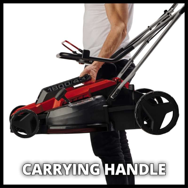 Електрична газонокосарка Einhell GC-EM 1800/43 є високоякісним, дуже потужним пристроєм для амбітних садівників-аматорів, що відповідає найвищим вимогам у скошуванні газонів середнього розміру. Потужний 1800 Вт Carbon Power двигун забезпечує відмінні результати різання навіть у густій траві завдяки його високому крутному моменту. Газонокосарка Einhell GC-EM 1800/43 має ширину зрізу 43 см та 6-ступінчасте осьове регулювання висоти стрижки, висота зрізу може бути попередньо обрана від 20 до 65 мм. Ергономічна ручка може бути скоригована до кожного користувача за допомогою простих налаштувань для особливо ергономічної роботи. Електрична газонокосарка рекомендується для безперервного косіння газонів площею до 800 м². Кабельний затискач для кріплення кабелю дозволяє зняти натяжіння та захищає кабель живлення від зношування та пошкоджень. Широкі колеса зберігають газон та полегшують роботу у важкодоступній місцевості. 50-літровий травозбірник забезпечує простір для великих робіт, необхідність очищення можна побачити завдяки індикатору рівня. Корпус та травозбірник 50 л виготовлені з ударостійкого пластику високої якості. Газонокосарка Einhell GC-EM 1800/43 оснащена складною, довгою ручкою, яка дозволяє зберігати у складеному вигляді газонокосарку у мінімальному просторі. Для зручності перенесення є вбудована ручка.