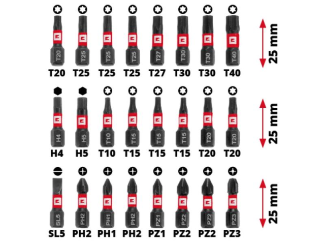 комплект входять 24 біти довжиною 25 мм, хвостовик C 6.3, шліц