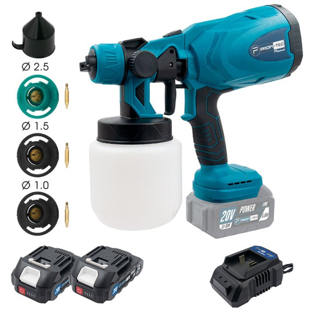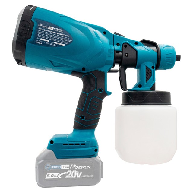 Акумуляторний фарбопульт PROFI-TEC PSG80020 – портативний та зручний інструмент, призначений для розпилення фарб, ґрунтовок, лаків та інших розчинних лакофарбових матеріалів на поверхнях різної складності та у важкодоступних місцях.