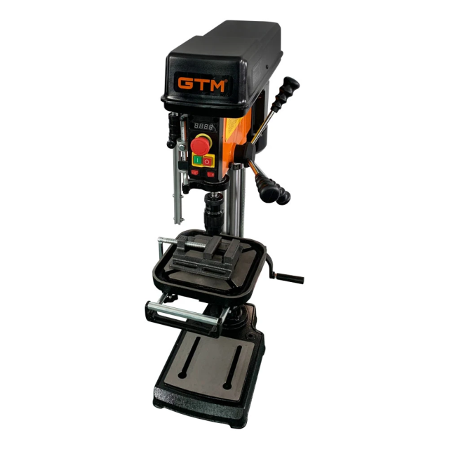 Верстат свердлильний GTM DB30 - професійне електричне обладнання для свердління глухих і наскрізних отворів в металевих, дерев'яних, пластикових і кам'яних деталях. Залежно від поставленого завдання може працювати з різними свердлами, зенкерами, розгорненнями, мітчиками і іншим інструментом. Дана модель має настільне виконання. Залежно від типу матеріалу, товщини або свердла, користувач може плавно налаштувати швидкість обертання патрона від 340 до 2200 об / хв. Для більшої зручності в конструкції передбачений цифровий індикатор поточної швидкості. Верстат комплектується лещатами розміром 75 мм, які розміщені на робочій майданчик. Залежно від деталі майданчик здатна обертатися на 360 градусів, підніматися або опускатися. GTM DB30 комплектується металевим швидкозажимним патроном на 16 мм і захисним екраном, для запобігання травм при роботі.