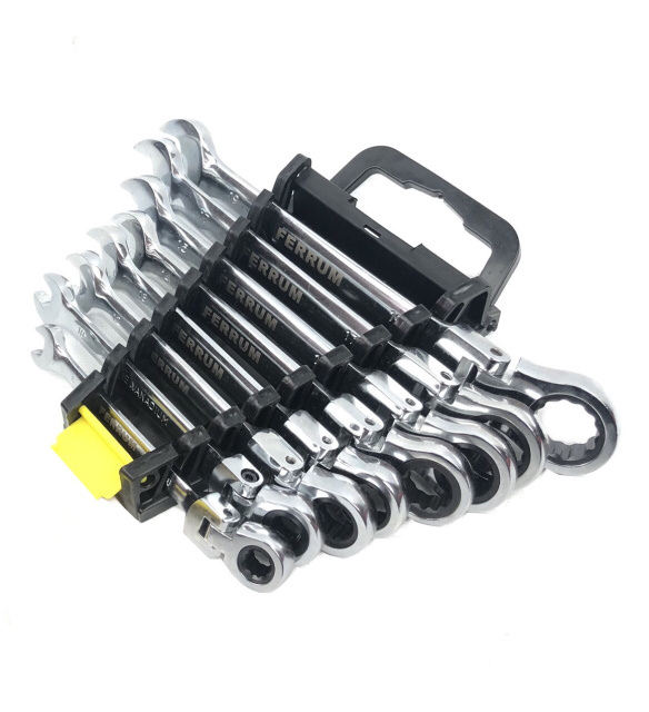Набір ключів ріжково-накидних с трещоткой Ferrum налічує у своєму складі 8 одиниць розміром від 8 до 19 мм. (8, 10, 12, 13, 14, 15, 17, 19 мм.)