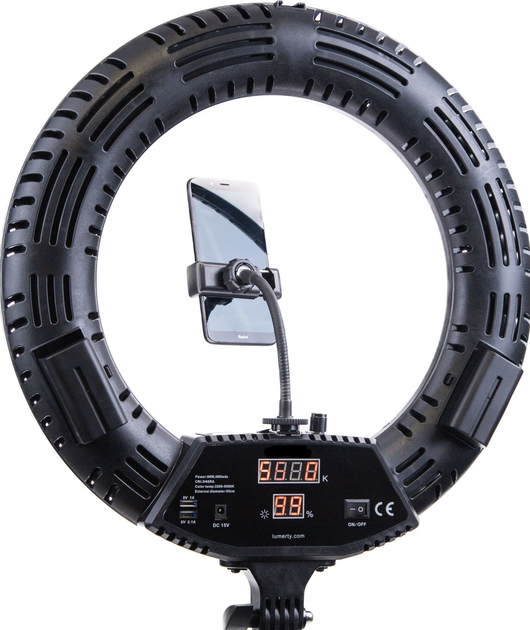 На лампе располагаются крепления, на которых фиксируется телефон. Можно поставить до трёх телефонов и снимать с разных ракурсов! Предусмотрены разъёмы для зарядки телефонов.