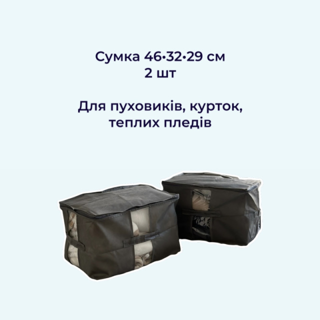 НАЛОЖЕННЫЙ ПЛАТЕЖ ТОЛЬКО ПО ПРЕДОПЛАТЕ 100ГРН Підтримаємо українського виробника! Наш интернет-магазин - производитель данных органайзеров. Экономьте время и деньги, приобретая товар на organize.in.ua. Набор из 6 сумок для хранения — готовое решение со скидкой Идеальный вариант для организации несезонных вещей. Не нужно выбирать по отдельности — мы уже собрали самые удобные размеры для вашего гардероба. В набор входят: ▪️ 2 большие сумки — для пуховиков, курток, пледов (46×32×29 см) ▪️ 2 средние сумки — для свитеров, костюмов, объёмного трикотажа (35×35×25 см) ▪️ 2 компактные сумки — для шарфов, шапок, варежек, термобелья (40×31×15 см) Сумки удобно размещаются на шкафу или под кроватью. Такой комплект помогает освободить место и легко поддерживать порядок. Купить органайзеры в Украине легко на сайте . Наводите порядок красиво — самое время органайзеры для дома купить с доставкой по всей стране.