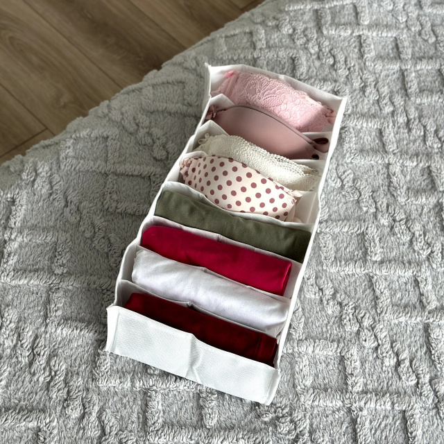 НАЛОЖЕННЫЙ ПЛАТЕЖ ПО ПРЕДОПЛАТЕ 100ГРН Гибкий текстильный органайзер 20×39×9 см белого цвета — практичное решение для удобного и эстетичного хранения нижнего белья, домашней одежды и детских вещей. Продуманная форма органайзера делает его идеальным для размещения в ящиках комодов, шкафах или на открытых полках. Материал — спанбонд — мягкий, лёгкий, дышащий и при этом прочный. Он не накапливает пыль, легко чистится и подходит для деликатных тканей. Размер органайзера позволяет удобно размещать майки, пижамы, сорочки, трусики, носки, а также детскую одежду. Гибкие стенки адаптируются к пространству, а структура органайзера помогает поддерживать порядок даже в самых компактных местах. Белый цвет придаёт изделию ощущение чистоты и свежести, легко сочетается с нейтральными интерьерами.