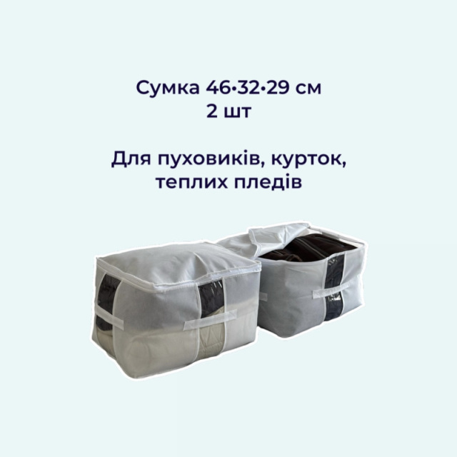 НАЛОЖЕННЫЙ ПЛАТЕЖ ТОЛЬКО ПРЕДОПЛАТЕ 100ГРН Набор из 6 сумок для хранения (белый цвет) — готовое решение со скидкой Готовый комплект для хранения несезонной одежды, который экономит ваше время и помогает поддерживать порядок в шкафу или под кроватью. В набор входят: ▪️ 2 большие сумки — для пуховиков, курток, пледов (46×32×29 см) ▪️ 2 средние сумки — для свитеров, костюмов, объемного трикотажа (35×35×25 см) ▪️ 2 компактные сумки — для шарфов, шапок, варежек, термобелья (40×31×15 см) Набор выполнен в белом цвете — символе чистоты и уюта, который вписывается в любой интерьер. Купить органайзеры в Украине легко на сайте . Наводите порядок красиво — самое время органайзеры для дома купить с доставкой по всей стране.